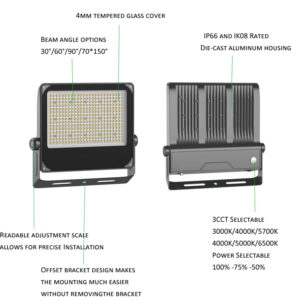 YL-FL01 Floodlight: Built with ADC12 die-casting (superior thermal management) and 4mm tempered glass (integrated breather valve for temp/humidity balance). Features ±120° adjustable offset bracket, IP66 protection, 4000K/5000K/5700K adjustable CCT, CRI >70/80, and a 5-year warranty—ideal for reliable outdoor lighting.